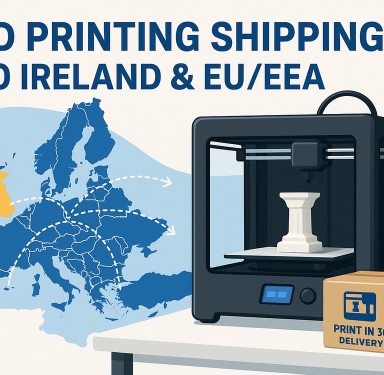 Discover how Print in 3D now offers fast, affordable 3D printing shipping across Ireland and selected EU/EEA countries! No customs fees, clear delivery times, and high-quality PLA prints—order your custom 3D models online and have them delivered straight to your door. Read more about our European shipping expansion!